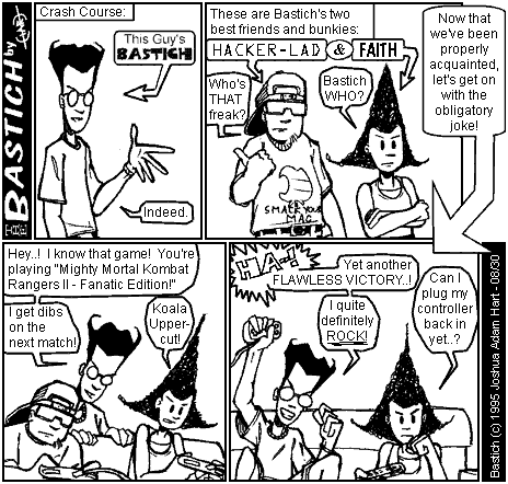 PANEL 4 Hacker-Lad and Faith are holding game controllers while Bastich addresses them from behind the couch they are sitting on. BASTICH: Hey..! I know that game! You're playing "Mighty Mortal Kombat Rangers II - Fanatic Edition!" I get dibs on the next match! FAITH: Koala Upper-cut!