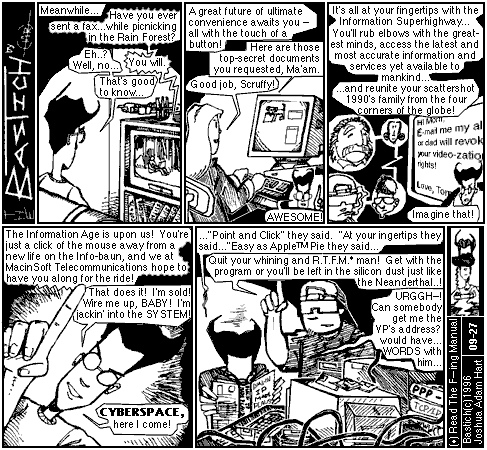 PANEL 5 (Later, Bastich is sitting at a new computer, complete with giant CRT monitor and a tower CPU case. He has his face buried in a manual titled "DIALIN IP MADE PLAUSIBLE" and he is surrounded by a tangle of cables, computer manuals, and floppy disks. Hacker-Lad stands behind him with his right index finger raised in lecture mode) BASTICH: ..."Point and Click" they said. "At your fingertips they said... "Easy as Apple(TM) Pie they said... HACKER-LAD: Quit your whining and R.T.F.M.* man! Get with the program or you'll be left in the silicon dust just like the Neanderthal..! BASTICH: URGGH-! Can somebody get me the VP's address? Would have... WORDS with him...