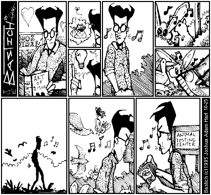 PANEL 9 (Later, Bastich walks out of the building alone, still whistling and counting a large wad of cash. The sign is revealed to say ANIMAL TESTING CENTER)