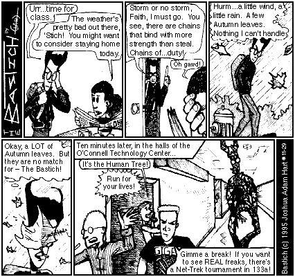 PANEL 4 (A large leaf flies into Bastich's face, covering his eyes) BASTICH: (Thinking) Okay, a LOT of Autumn leaves. But they are no match for - The Bastich!