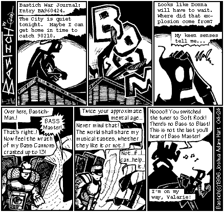 PANEL 6 (BASTICH-MAN runs off as BASS MASTER shakes his fist in silhouette with soft musical notes emitting from his speakers.) BASS MASTER: Nooooo!! You switched the tuner to Soft Rock! There's no Bass to Blast! This is not the last you'll hear of Bass Master! CAPTION: I'm on my way, Valarie!