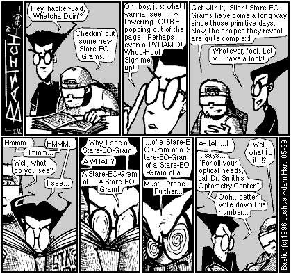 PANEL 3 (HACKER-LAD raises his hand dismissively as BASTICH looks on.) HACKER-LAD: Get with it, 'Stich! Stare-EO-Grams have come a long way since those primitive days. Now, the shapes they reveal are quite complex! BASTICH: Whatever, fool. Let ME have a look!