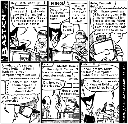 PANEL 6 (HACKER-LAD shows the object to BASTICH as both are walking someplace outdoors.) CAPTION: Later Still. BASTICH: So you got fifty bucks for fixing a computer problem that didn't exist? HACKER-LAD: Yup. That, and an extra 16 megs of RAM to put in my Linux box..!