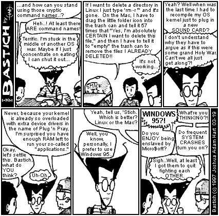 PANEL 5 (Close up of BASTICH.) HACKER-LAD: Yeah, tell us, 'Stich. Which is better? Linux or the Mac? BASTICH: Well, you know, personally, 1 prefer to use windows 95...