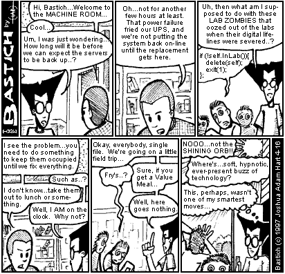 PANEL 1 (BASTICH approaches the SENIOR ADMIN in the machine room.) SENIOR ADMIN: Hi, Bastich... Welcome to the MACHINE ROOM. BASTICH: Cool... Um, I was just wondering... How long will it be before we can expect the servers to be back up..?