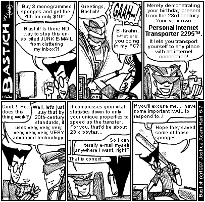 PANEL 1 (BASTICH shakes his fist at his computer screen.) BASTICH: "Buy 3 monogrammed sponges and get the 4th for only $10!" Blast it! Is there NO way to stop the unsolicited JUNK E-MAIL from cluttering my inbox?!