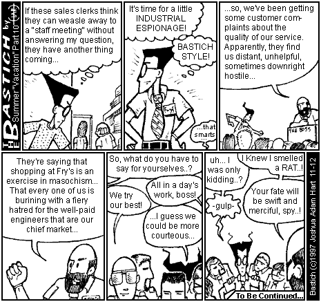 PANEL 6 (BASTICH is exposed. He gasps as two FRY'S WORKERS grab his shoulders and the BOSS leers at him.) BASTICH: Uh... I was only kidding..? FRY'S BOSS: I knew I smelled a RAT..! BASTICH: -gulp- FRY'S BOSS: Your fate will be swift and merciful, spy..! CAPTION: To Be Continued...