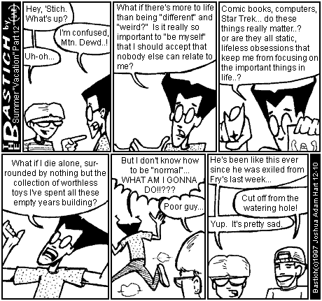 PANEL 1 (MTN. DEWD greets BASTICH.) MTN. DEWD: Hey, 'Stich. What's up? BASTICH: I'm confused, Mtn. Dewd..! MTN. DEWD: Uh-oh....