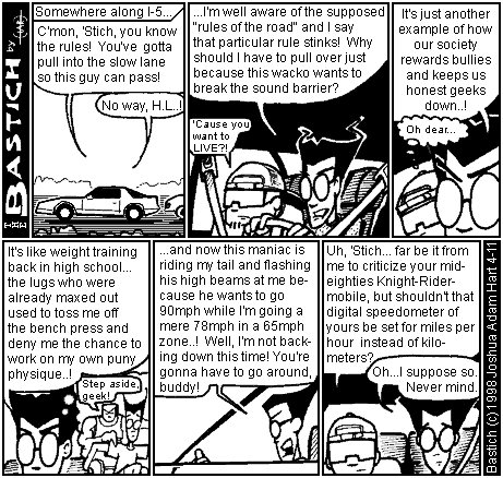 PANEL 6 (HACKER-LAD makes an observation and BASTICH has a moment of humility.) HACKER-LAD: Uh, 'Stich... far be it from me to criticize your mid-eighties Knight-Rider-mobile, but shouldn't that digital speedometer of yours be set for miles per hour instead of kilometers? BASTICH: Oh... I suppose so. Never mind.
