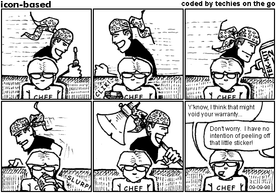 PANEL 6 (MTN. DEWD speaks to an off-panel BAPPER.) MTN. DEWD: Y'know, I think that might void your warranty... BAPPER: Don't worry. I have no intention of peeling off that little sticker!