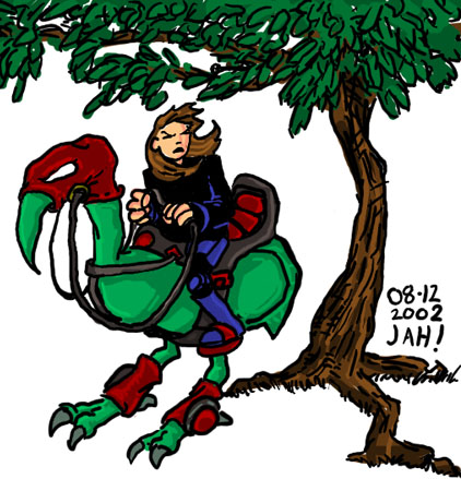 It has been brought to my attention that I draw more than my fair share of "Battle Chickens" and the truth is I just can't get enough of them. They're about the easiest thing to draw in the world because they look cool and are almost completely immune to intrusive and annoying issues such as "anatomy" and "plausibility". In fact, I've noticed that including a Battle Chicken automatically grants the illustrator full diplomatic immunity from making any sort of sense at all. It's as if, once you decide to toss in such a baffling beast of burden, a disbelief-suspension field is created and spread across the canvas, and the viewer's mind simply quits trying to apply reason to anything he or she is seeing. Mobius and Vaughn Bode both used this technique to great effect, driving entire generations of teenagers to a life of drugs, psychedelia and Paladium RPGs way before their time.