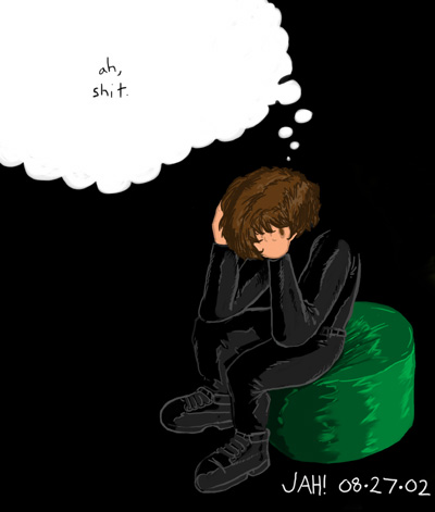Tonight, in an effort to acheive some sort of arty "emotional range," I set out to draw the weepiest thing I could think of, so here we are. This guy is obviously upset about something. Probably found a crease in his copy of Sandman #1 or can't find his Floodland CD.