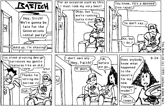 This strip is a bit of a time capsule for what was happening in my corner of Trek fandom at the time. The VHS of Star Trek: Generations had just been released to rental markets, and Star Trek: Voyager was still the hot new Trek series (premiering January 16, 1995). I don't remember having a Generations watch party, but it was clearly on my mind (even though I was disappointed by the film itself when I first saw it on the big screen).