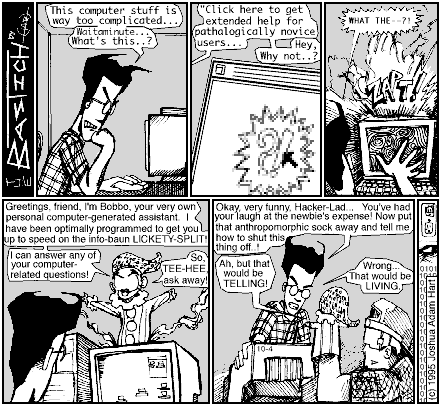 PANEL 2 (On the computer screen, a mouse cursor hovers over a dialog box with a splash balloon icon) BASTICH: "Click here to get extended help for pathologically novice users..." Hey, why not...?