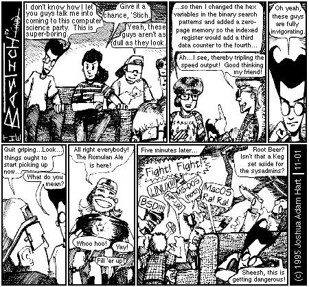 PANEL 6 (Later, Bastich cowers behind a couch as the whole nerd party has turned into a wild brawl) CAPTION: Five minutes later... FIGHTING NERDS: Fight! Fight! BSD!!! LINUX!!! HP-UX! MS-DOS (not!) MacOS Ra! Ra! OFFSCREEN NERD: Root Beer? Isn't that a Keg set aside for the sysadmins? BASTICH: Sheesh, this is getting dangerous!