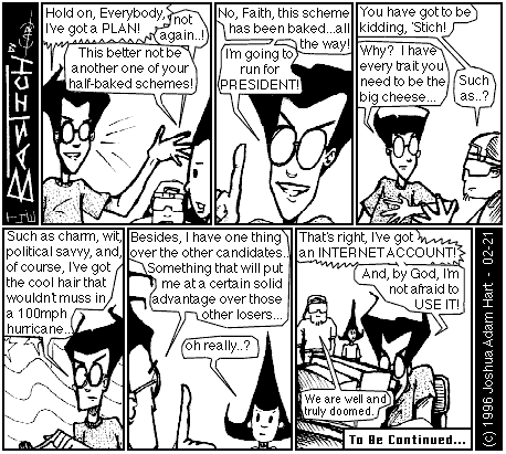 PANEL 6 (BASTICH leaps behind the huge CRT monitor of his computer and begins typing frantically as HACKER-LAD and FAITH look on from a distance.) BASTICH: That's right, I've got an INTERNET ACCOUNT! And, by God, I'm not afraid to USE IT! HACKER-LAD: We are well and truly doomed. CAPTION: To Be Continued...