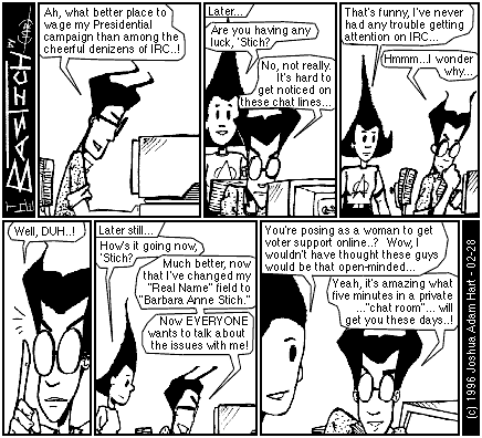PANEL 1 (BASTICH sits at his computer typing away.) BASTICH: Ah, what better place to wage my Presidential campaign than among the cheerful denizens of IRC..!