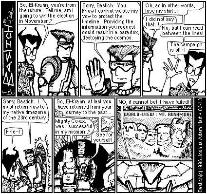 PANEL 1 (BASTICH and EL-KRAHN THE FUTURE GUY are walking side-by-side outside. BASTICH is wearing a pin that reads "BASTICH 4 PREZ".) BASTICH: So, El-Krahn, you're from the future...Tell me, am I going to win the election in November..?
