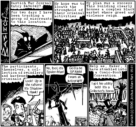 PANEL 4 (The crowd tugs on BASTICH-MAN'S cape, pulling him down from the rafters.) NERD 2: No, fool, it's Spider-Man! NERD 3: Gotta be SPAWN! NERD 4: I want an autograph!
