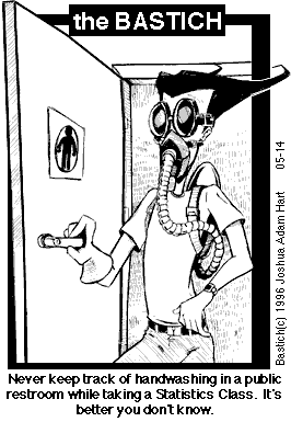 PANEL 1 (BASTICH walks through a public restroom door wearing a gas mask.) CAPTION: Never keep track of handwashing in a public restroom while taking a Statistics Class. It's better you don't know.