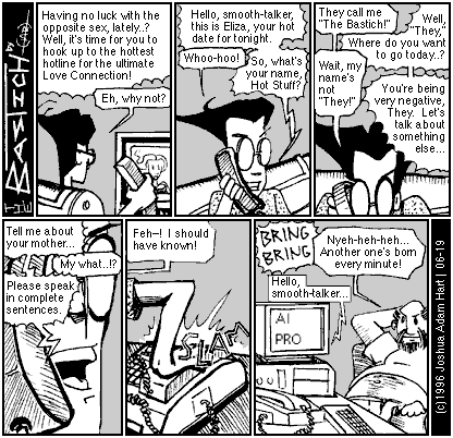 PANEL 6 (Somewhere else, a computer with the words "AI PRO" on the screen answers another phone call while an overweight bearded man reclines contentedly in his chair.) SFX: BRING! BRING! ELIZA: Hello, smooth-talker... MAN: Nyeh-heh-heh... Another one's born every minute!