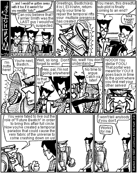 PANEL 5 (BASTICH shoves FUTURE-STICH.) BASTICH: Well, so long. Don't forget to write! FUTURE-STICH: Hey, pal, I'm not going anywhere! BASTICH: Is that so?