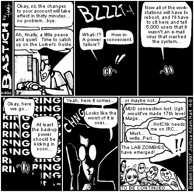 PANEL 6 (BASTICH reacts in shock as a horde of zombies approach the Helpdesk.) BASTICH: ..or maybe not. ZOMBIE 1: MUD connection lost. Ugh... would've made 17th level Mage... ZOMBIE 2: ...HotChk needs me on IRC... ZOMBIE 3: Must... write... Perl... BASTICH: The LAB ZOMBIES have emerged! CAPTION: TO BE CONTINUED...