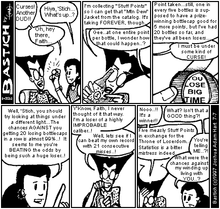 PANEL 2 (BASTICH holds up a catalog.) BASTICH: I'm collecting "Stuff Points" so I can get that "Mtn Dew" Jacket from the catalog. Its taking FOREVER, though. FAITH: Gee... at one entire point per bottle, I wonder how that could happen..?