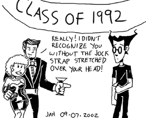 PANEL 1 (In front of a banner reading "CLASS OF 1992", a muscular man in a tuxedo and a woman in a shiny evening gown face BASTICH, who is wearing a black T-Shirt and jeans.) MAN: Really! I didn't recognize you without the jock strap stretched over your head!