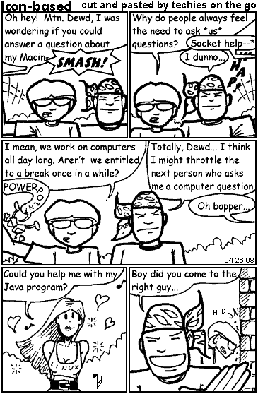 This was the first strip of the "Icon-Based" series, a spinoff of "The Bastich" starring Mtn. Dewd and Bapper. It was a collaboration with the "real-life" Mtn. Dewd and Bapper, with the three of us going by the name "techies on the go". The two of them contributed most of the good stuff which I then put through the grinder to produce what you see here.