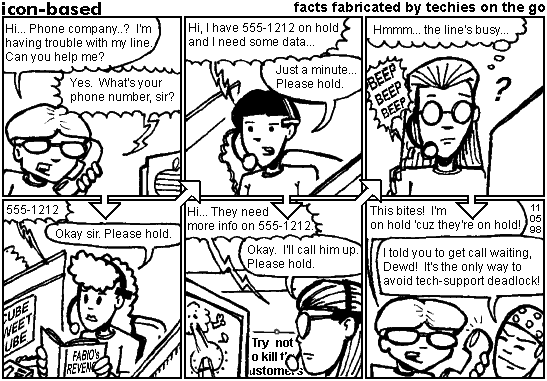 PANEL 6 (MTN. DEWD glares at his phone while BAPPER chimes in from the background.) MTN. DEWD: This bites! I'm on hold 'cuz they're on hold! BAPPER: I told you to get call waiting, Dewd! It's the only way to avoid tech-support deadlock!