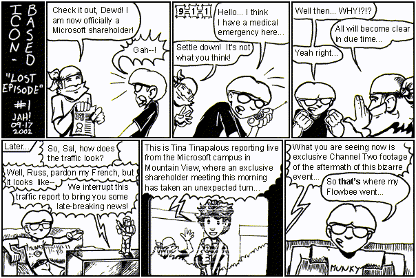 PANEL 1 (BAPPER surprises MTN. DEWD by presting a stock certificate.) BAPPER: Check it out, Dewd! I am now officially a Microsoft shareholder! MTN. DEWD: Gah--!